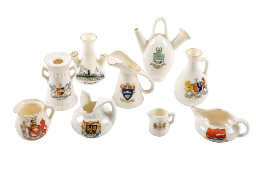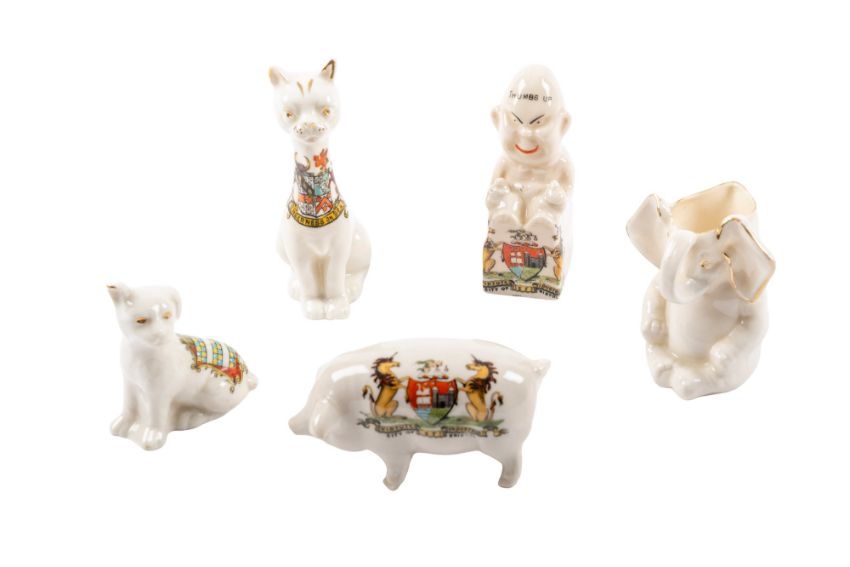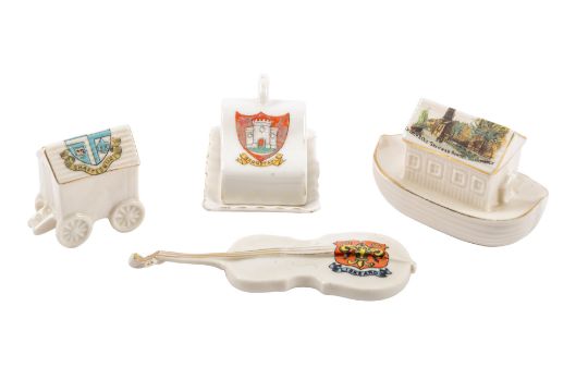 A collection of WWI period crested ware, including a model 'Remember the Lusitania', an E5 submarine, a battle ship, an ambulance, two busts of sailors, a tanks and others, various makers and crests. (some damage)