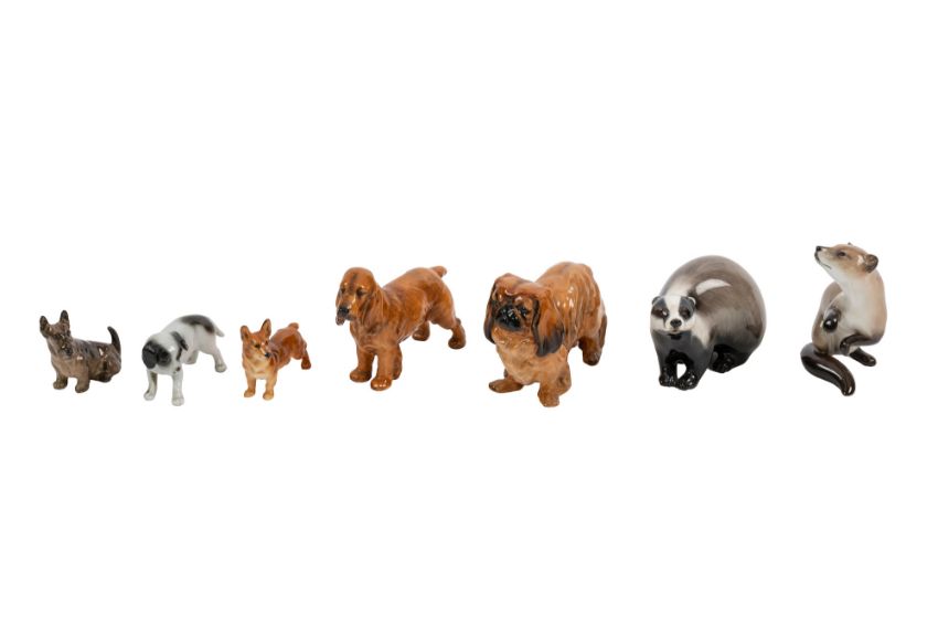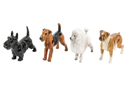 A collection of seventeen Beswick dogs. Including Poodle 2339, Corgi 1736, Yorkshire Terrier 2102 and others plus a badger 3393, and tiger 2096 etc.
