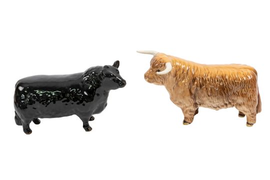 A Royal Doulton Hereford Cow and Calf figure group. On a wooden base, together with five Beswick cow figures including Highland Cow 1740 etc.