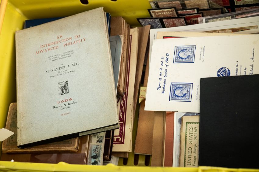 Literature. A large storage box of Philatelic Reference books, Auction catalogues, Photographic Plates etc.