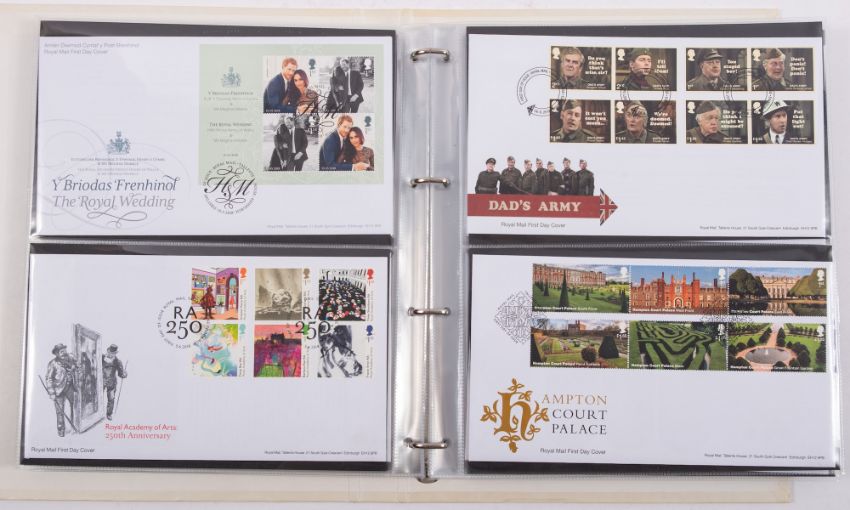 Great Britain. A collection of mainly Great British stamps offered intact, in five large boxes. Strength in presentation packs and more recent FDCs to 2024. Also noted an 1840 1d black in Harrington and Byrne Folder, German occupation of the Channel Islands FDCs, some USA.
