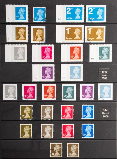 Great Britain. A useful collection of Machin issues, with many identified (not guaranteed), MNH and used, housed in a boxed album on stock pages. Some additional Cinderella items, and copies of early GB High Values.