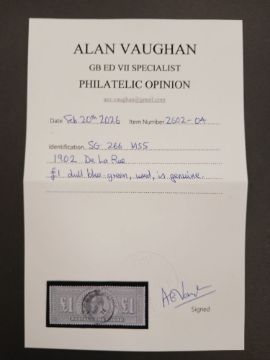 Great Britain. 1902 De la Rue King Edward VII £1 dull blue-green, very fine used CDS, SG 266 (M55). With an AV certificate.