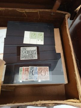 Great Britain. A valuable early to mid period in two old suitcase, containing small boxes of stamps and covers, loose Queen Victorian, 4 margin 1d Black on front, a further 1d black on cover, 1840 2d Blue on cover (x 2 covers), good Kings with mint blocks, noted MNH 1912-24 Royal Cypher 9d olive green Control Pair unmounted mint, 1929 PUC £1 MNH, KGVI 1939 - 48 HV set MNH, other interesting material, some British commonwealth, viewing highly recommended.