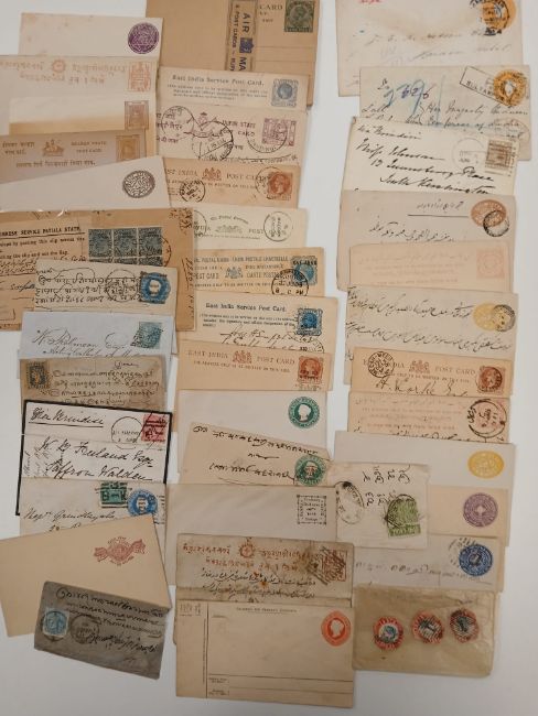 India. A useful collection of covers, postal history, fronts, including 1893 Embossed registered cover to 'her majesty the Queen' (with 'Too Late' strike reverse), a Queen Victoria Postal Stationery cover Registered to Delhi 1926 (25 years after Victoria's death), Imperf on front, and other interesting. Plus three 1854 4 anna stamps cut to shape.