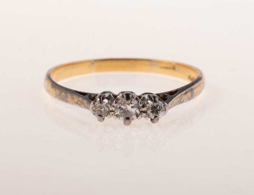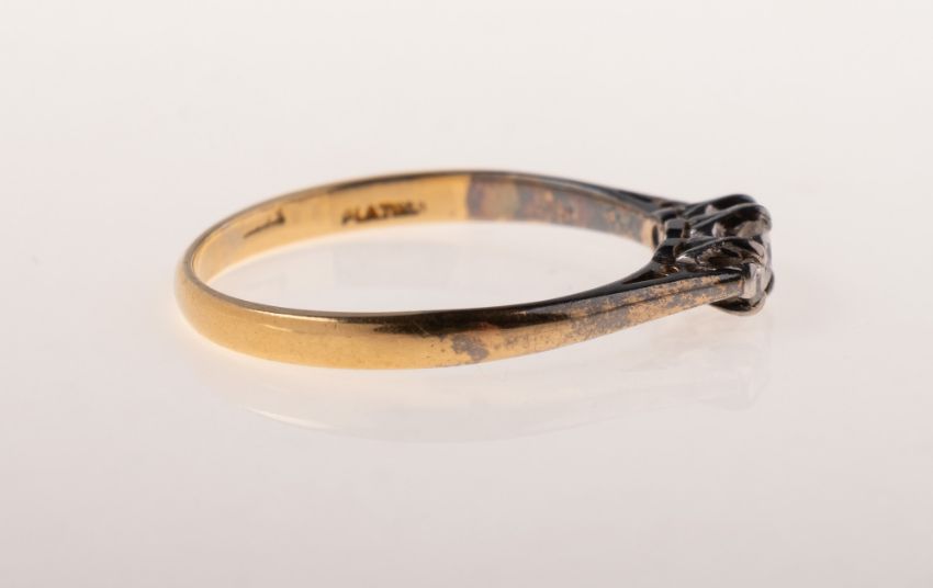 A three stone diamond ring, claw set with three single-cut diamonds, marked indistinctly 18ct & PLAT, size P, 2.1grams.