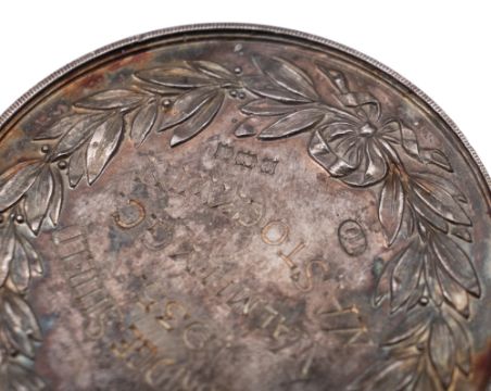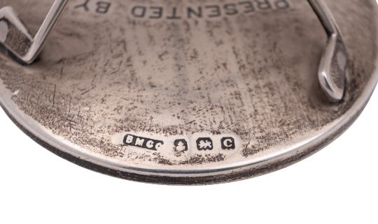 Golfing interest:- four silver Warwickshire Union of Golf Club medals (A "Challenge Cup" & "Challenge Flag" medal for Handsworth Golf Club 1930, by Munsey & Co Ltd, Birmingham 1929 and a "Challenge Flag" and "Bainbridge Shield" medal from Walmley Golf Club 1932 & 1935, makers mark "TO", Birmingham 1931/34), all inscribed with the winner "W.A.S. Stockwin", together with a small silver stand with three golf clubs, inscribed "PRESENTED BY DUNLOP RUBBER CO. LTD", a small silver dressing table box inscribed "WALMLEY LADIES GOLF CLUB FINAL MEDAL SEP 26TH 1912" and another silver "INSURANCE ATHLETIC ASSOCIATION CHAMPIONSHIP" medal, inscribed on the back "TUG-OF-WAR N.W BOWIE 1938", by different makers & dates; the stand 2.7" (6.8cm) high; 5.3ozt weighable silver (7)