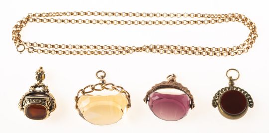 A group of four fobs and a 9ct gold belcher chain, including an early 20th century 9ct gold floral and foliate carved swivel fob set with a purple paste stone, UK hallmark, Chester, 1914, TJS, width approx. 3.0cm, 11.8grams; a 9ct gold chain link swivel fob set with a yellow paste stone, indistinct hallmark, width approx. 3.3cm, 20.0grams; an ornately carved floral and foliate three sided stone set fob, unmarked yellow metal, length approx. 3.5cm, 17.0grams; a gilt double sided swivel clasp, marked P&T, length approx. 3.5cm; and a 9ct gold belcher link chain, UK import mark 375 to jump ring, length approx. 66.0cm, 6.0grams, (5). (Note: the approximate weight of the fobs includes the stones).