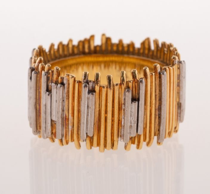 Charles de Temple, a superb mid-century 18ct gold sculptural ring, the ring of sculptural brutalist textural design, in 18ct yellow and overlapping white gold, UK hallmark, London, 1971, marked CdeT & CDET 18ct, width approx. 10.0mm, size M to M1/2, 9.2grams. (Note: Charles de Temple, was a renowned modernist goldsmith in London, active from the 1960s to the 1990s).