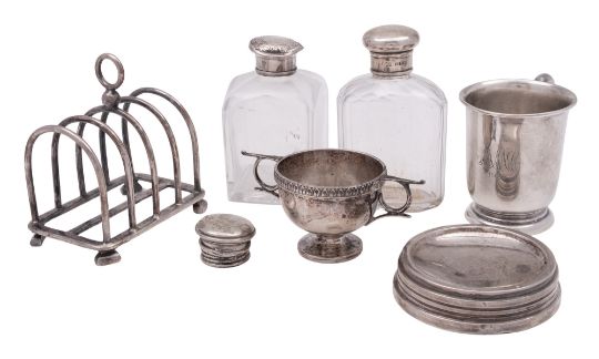 A mixed lot of various silver, to include two mounted clear-glass scent bottles, a christening cup, a strainer base, a small trophy cup, a bottle top and a toast rack, some of the above initialled, mixed makers & dates; the toast rack 3.3" (8.7cm) long; 8.3ozt weighable silver (7)