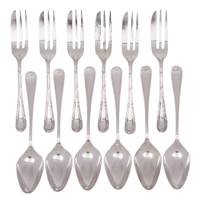 A George V set of six silver pastry/ cake forks, Ribbon & Reed pattern, by Viner's Ltd, Sheffield 1934, together with an Elizabeth II set of six silver Feather-edge grapefruit spoons, by Gee & Holmes, Sheffield 1965; 6.75ozt (12)