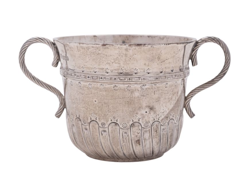 A George V small silver porringer, campana form, with twin rope-work handles, a wrythen-fluted lower body and an embossed girdle, by Thomas Bradbury & Sons, Sheffield 1925; 3" (7.6cm) high; 5ozt