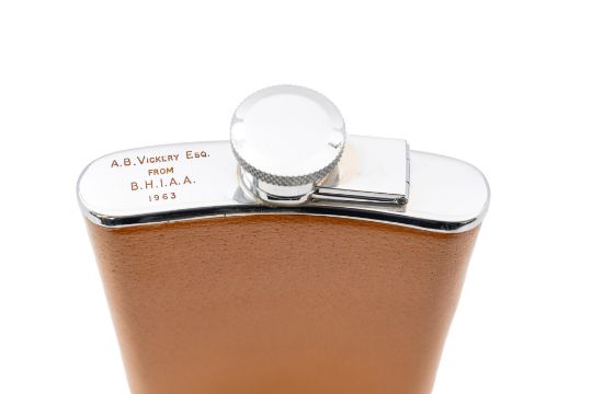 A silver stamp box, in the form of an envelope, marked "STERLING SILVER" only, together with another silver stamp box, with engraved decoration (A/F) and a metal spirit flask; the flask 5.25" (13.3cm) long; 0.3ozt (3)