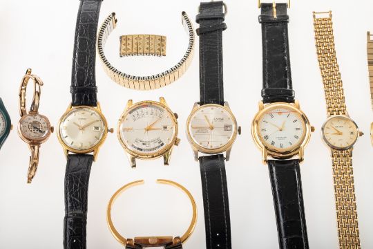 A selection of fourteen various wristwatches to include Claridge Shockproof, a lady's gold-plated wristwatch, the silvered dial having black Arabic numerals, raised decoration to the centre and blued-steel moon hands, with an expandable gold-plated bracelet, diameter 22mm. Orient, a gentleman's gold-plated calender wristwatch with date and month calculator to the dial, the rear of the case stamped Olympia Calendar, Orient, 026873, diameter 40mm. Bulova, a gold-plated wristwatch the square dial with raised numerals and baton hands, the square case with integral bark-finish bracelet, diameter 22mm. Seiko Quartz, a lady's gold-plated wristwatch, the dial with raised baton numerals and baton hands, diameter 18mm. Ling, 21 Priz, a lady's gold-plated wristwatch, the silvered oval dial with raised baton numerals and baton hands, with inset paste to the bezel and integral gold-plated engraved bracelet, diameter 20mm. Montine of Switzerland, a lady's gold-plated wristwatch the oval silvered dial with raised baton numerals and baton hands, with integral bark-finish gold-plated bracelet, diameter 18mm. Sekonda Quartz a lady's gold-plated wristwatch the round silvered dial having raised baton numerals and gilded dauphine hands, with integral bracelet, diameter 24mm. Martini, two plastic wristwatches with decorative dials and integral bracelets, diameter 35mm. R. Rosner Quartz, a gold-plated wristwatch the round white dial having black Roman numerals, a sweep seconds hand and dauphine hands, with a black leather strap, diameter 38mm. Lamar De Luxe Lifetime Mainspring Antimagnetic, a gentleman's gold-plated wristwatch the round silvered dial with raised block numerals, lined decoration, date aperture and sweep seconds hand, with a black leather strap, diameter 35mm. Accurist 21 Jewels, Shockmaster, a gentleman's gold-plated wristwatch, the gilded dial with dauphine hands, a sweep seconds hand and date aperture, with a gold-plated expandable bracelet, diameter 35mm Roamer, a gentleman's wristwatch, the silvered dial having raised baton numerals, baton hands,a sweep seconds hand and date aperture, the rear of the case stamped Roamer, Swiss Made, Brevete, 305467, 305776, 307382, 308491, with a black leather strap, diameter 34mm. Sekonda Quartz, a gold-plated wristwatch. Corvine 17 Jewels, a rectangular lady's gold-plated cocktail watch bracelet with inset paste decoration.