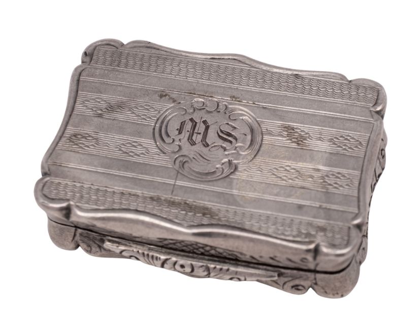A Victorian "castle-top" silver vinaigrette, of shaped rectangular form, the cover engraved with a view of Crystal Palace, the engine-turned base initialled and opening to reveal a scroll pierced grille, gilt interior, by David Pettifer, Birmingham 1850; 1.5" (3.8cm) long; 0.55ozt