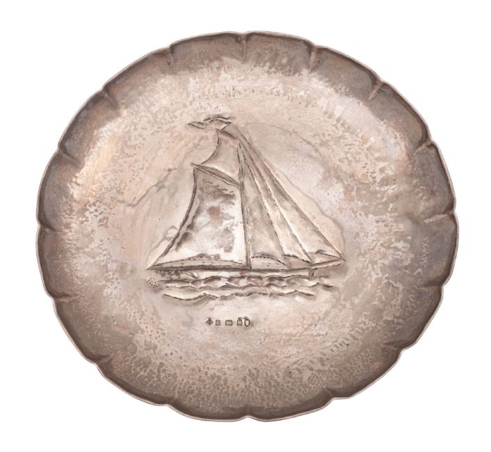 A 20th century shallow silver dish, of shaped circular outline and chased in the centre with a sailing yacht at full sail, by G. Danks, Birmingham 1934; 9" (22.8cm) diameter; 8ozt