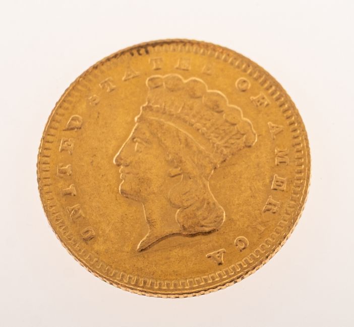 A one dollar coin, 1868, marked United States of America to verso, 1.6grams.