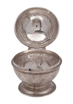 A George III silver soap box, of globular form, decorated with later flat chasing, the hinged cover with a putti & ball finial and the whole on a spreading circular foot (loaded), makers mark of Paul Storr partially visible, London 1817; 5" (12.7cm) high
