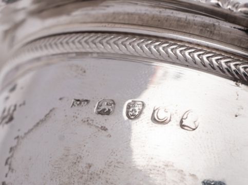 A George III silver wine funnel, with a tongue & dart border, applied straps and a disk-shaped tang, crested, makers mark partially worn, possibly by Solomon Royes, London 1818; 5.1" (13cm) high; 5.4ozt