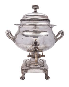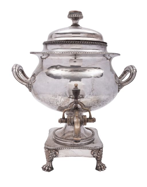 An Old Sheffield plated tea urn or samovar, circular form, on a shaped pedestal base, with paw feet, twin handles and a pull off cover, together with a silver plated octagonal kettle on stand; the former 16.75" (42.5cm) high (2)
