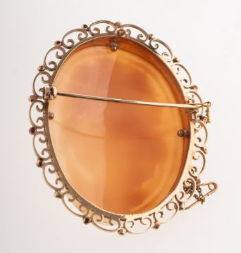 A 1970's 9ct gold cameo brooch, the cameo carving depicting three ladies, in a plain, rope twist and openwork filigree style mount, safety chain, UK hallmark, measuring approx. 6.5cm x 5.2cm, 22.1grams