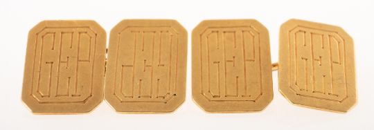 A pair of Art Deco 18ct gold cufflink's, of rectangular form, each engraved with the initials 'GEP', chain link fitting, UK hallmark, Birmingham, 1934, OP, (Owen Powell), 8.0grams.