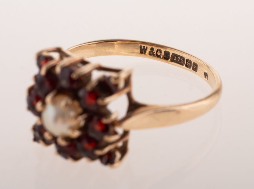 A vintage 9ct gold garnet and pearl cluster, of square form, claw set to the centre with a cultured pearl and a surround of circular-cut garnets, UK hallmark, size O, 2.6grams.