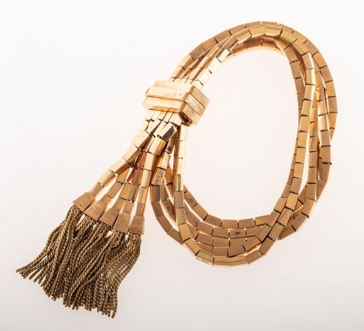 An impressive late 20th century Italian tassel bracelet, circa 1970's/80's, the bracelet made up of five strands of articulated brick style links, conjoined towards the end and each strand terminating with a fine chain fringe tassel, capped by ribbed conical fittings, the geometric ribbed box style safety clasp is hinged on both sides to form a concealed clasp when closed, marked 750, 347MI, (Milan), length approx. 19.0cm to conjoined section, approx. 26.0cm including the tassels, 89.3grams; accompanied by a box marked 'Casini, Firenze'.