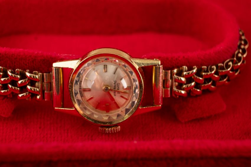 Girard-Perregaux an 18K gold lady's wristwatch the round silvered dial having raised baton numerals, baton hands and signed Girard-Perregaux with a round faceted glass bezel, the rear of the round case stamped 80090054 with the case stamped within 18K, .750 and Girard-Perregaux trademark with the gate-link bracelet hallmarked for 9K gold, London 1997 and stamped NK Wristwear, the movement having a lever escapement and stamped G.P., 6189, 864, diameter 16mm, gross weight 18.8gs. With red Girard-Perregaux box. Note: For details of the N.K. Watch Case Manufacturing see lot 432.