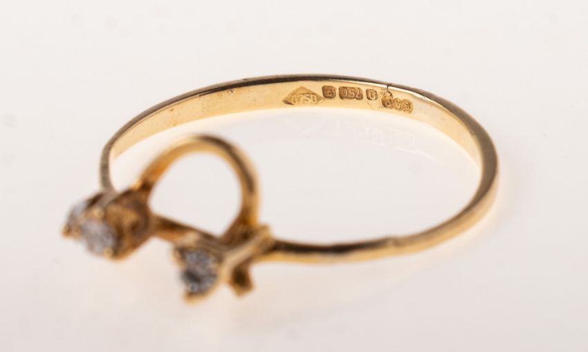 A diamond wirework ring, of abstract openwork form, claw set with three small single-cut diamonds, UK import mark, 750, size approx. I1/2 to J, 1.2grams