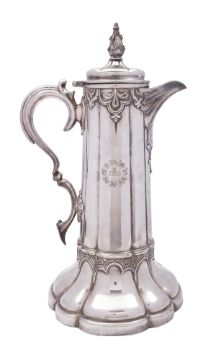 A large silver plated communion flagon, lobed circular form, with applied decoration and a scroll handle, the body engraved with "IHS" Christogram and the base with the applied makers plaque of James Dixon & Sons; 15.75" (40cm) high.