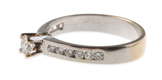 A diamond ring, claw and raised set to the centre with a brilliant-cut diamond, diamond approx. 0.25 carat, channel set to each shoulder with six graduated brilliant-cut diamonds, diamonds approx. 0.10 carat total, indistinctly marked 750, size O1/2 to P, 3.6grms.