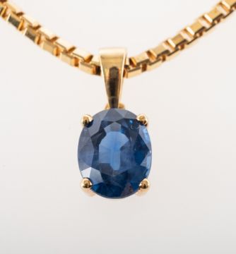 A sapphire pendant, the pendant claw set with an oval-cut sapphire, sapphire measuring approx. 8.2mm x 6.5mm x 4.2mm, approx. 1.79 carats, bale marked 18K, 750, length approx. 1.4cm, (inc. bale), 1.0grams; accompanied by a gold plated square link chain, length approx. 47.0cm.