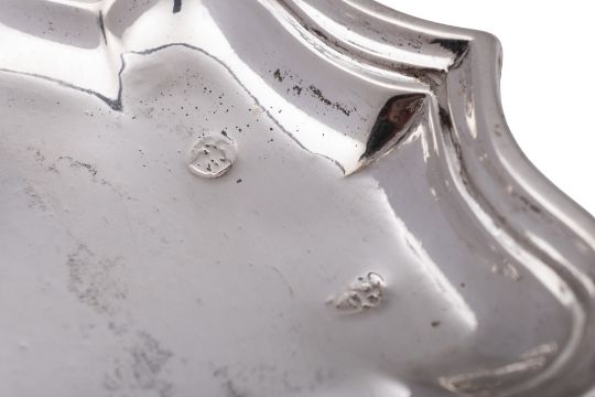 An 18th century Irish silver salver, of shaped hexagonal outline, with a moulded border, engraved in the centre with a coat of arms and raised on three hoof feet, makers mark "GB", Dublin c.1750 (no date letter); 8" (20.3cm) diameter; 14.2ozt
