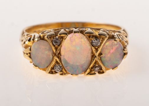 A 1970's 18ct gold opal and diamond ring, set with three oval opal cabochons, each interspersed with two single-cut diamonds, scroll carved gallery and shoulders, to a plain band, UK hallmark, London, 1974, size M1/2 to N, 5.7grams.