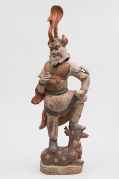 A Chinese Tang Dynasty grave guardian: modelled in the guise of a fierce bearded warrior with bulging eyes wearing an ornate helmet and elaborate armour standing on a recumbent deer, 90 cm high, [slight glue repair, over painting to deer]