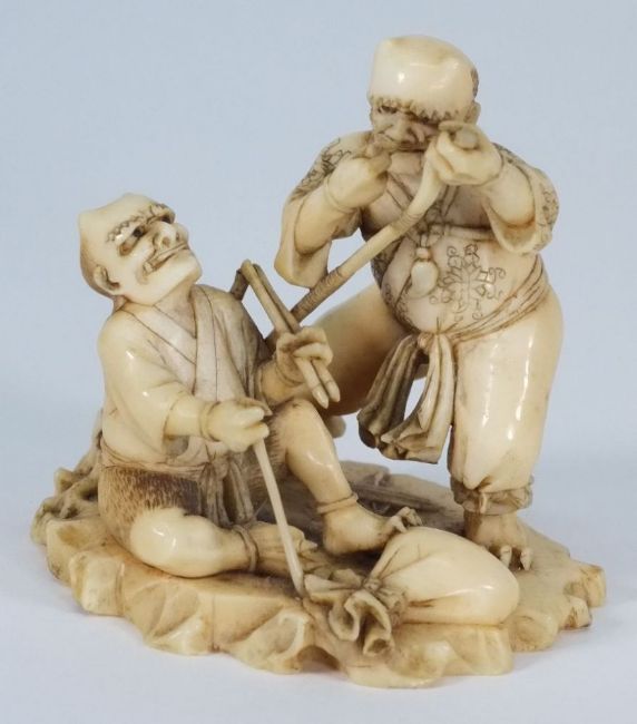 A Japanese okimono of two demons:, one standing and stringing a bow, the other seated, on a naturalistic base, signed to underside, 6cm high.