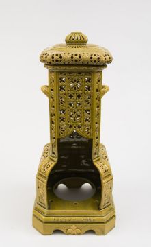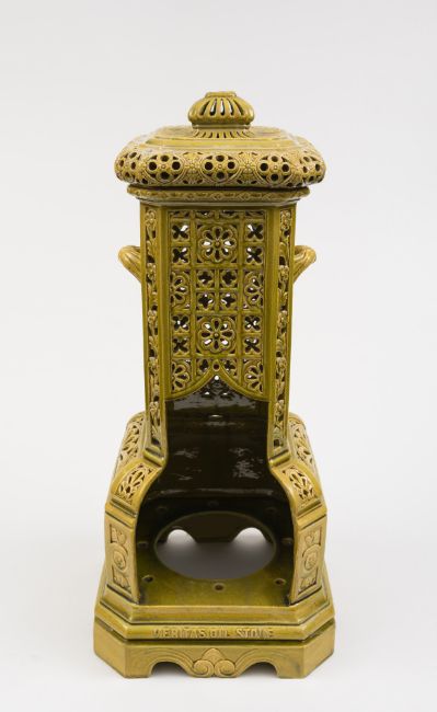 A Burmantofts faience stove and cover: of canted square profile with pair of handles, intricately pierced in the Persian taste with flower, anthemion and quatrelobed motifs under a green glaze, embossed Veritas Oil Stove and verso Burmantofts Faience, circa 1885, 71 cm high, [cover restored].