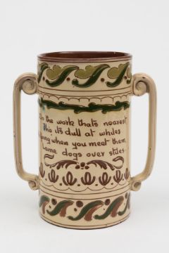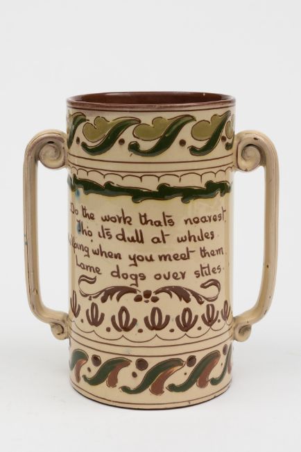 An Aller Vale (Torquay) pottery loving cup: of cylindrical form, the handles with scroll terminals incised and applied with coloured slips with a bird in flight amongst foliate scrolls and verso 'Do the work thats nearest, Tho its dull at whiles, Helping when you meet them, Lame dogs over styles, 19.5 cm high, [minor glaze flake on rim].