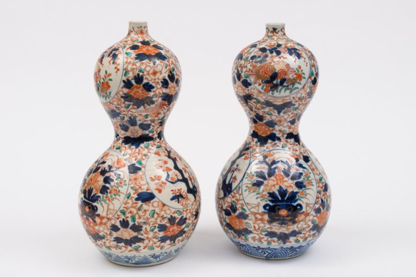 A pair of Japanese Imari porcelain vases: of double gourd form each painted with circular panels of jardinieres of blooms, prunus and pomegranate on a peony scroll ground, Meiji, 31 cm high.
