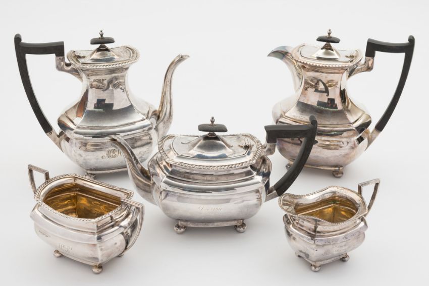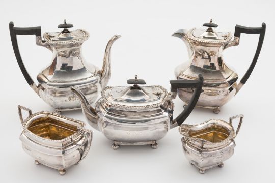 An Edward VII/George V matched five-piece silver tea and coffee service, maker Walker & Hall, Sheffield, 1908 and 1910: initialled, of barge shaped outline with gadrooned borders and raised on ball feet, 92.06ozs.