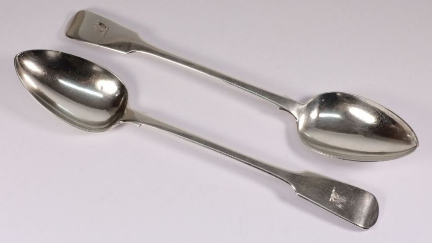 A pair of William IV silver fiddle pattern serving spoons, maker James Peachy, London, 1831: crested, 32cm long, 9.68oz.