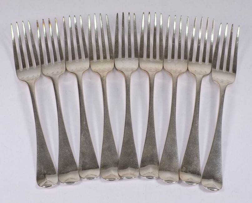 A set of five George III Old English table forks, maker William Eley, William Fearn & William Chawner, London 1809: crested, and a set of four George III Old English table forks, maker William Eley & William Fearn, London 1807, crested, total weight of silver 20.25ozs. (9)