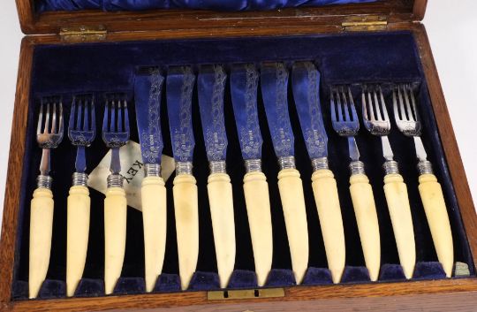 An Edwardian silver and ivory handled cased fish set, maker Robert Pringle & Sons, Sheffield 1904:, the blades and tangs with scroll engraved decoration, in an oak case with vacant brass cartouche.