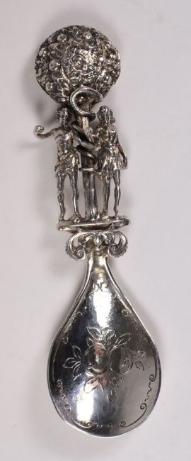 A Continental silver preserve spoon, bears import marks for Berthold Muller, Chester, 1909: with pear-shaped bowl with engraved apple decoration, the stem and terminal in the form of Adam and Eve beneath the apple tree, 15cm. long, 2.04ozs.