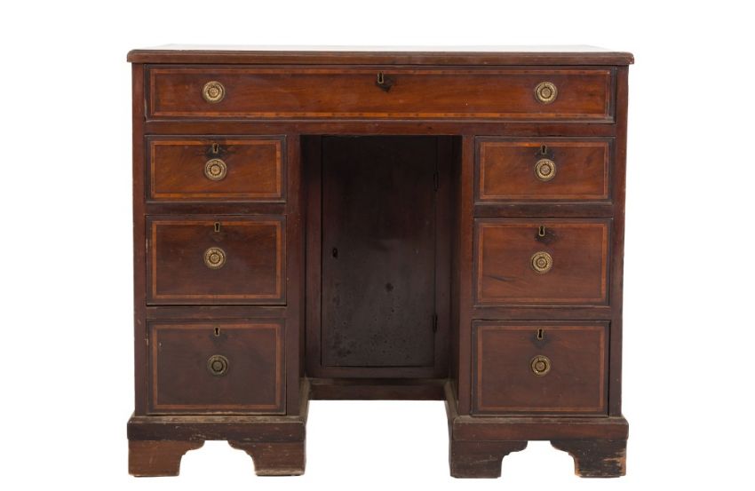 By Jas. Shoolbred & Co - A 19th Century mahogany crossbanded and inlaid kneehole desk:, bordered with boxwood lines, the top with a moulded edge, fitted with a single long frieze and six short drawers about a central recessed enclosed cupboard, on bracket feet, 85.5cm (2ft 9 3/4in) wide. *Notes The drawer stamped Jas Shoolbred & Co.