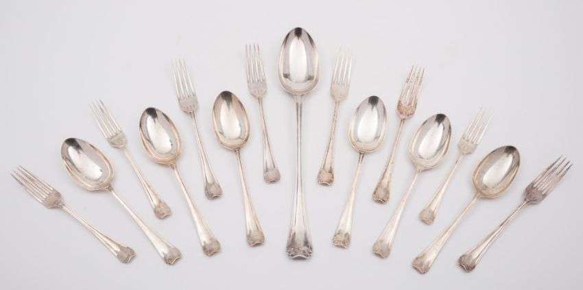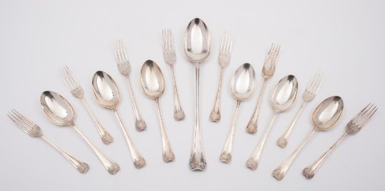 An Edward VII Onslow-style pattern part flatware service, maker HA, Sheffield 1909: comprising six table forks, six dessert forks, six dessert spoons and a basting spoon, 40.75ozs.