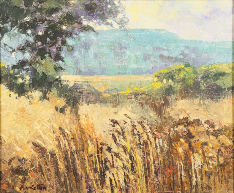 * Alan Cotton [b.1936]- Otter Valley, Harvest Landscape:- signed bottom left further signed, inscribed and dated 1986 on the reverse oil on canvas 25 x 30cm.