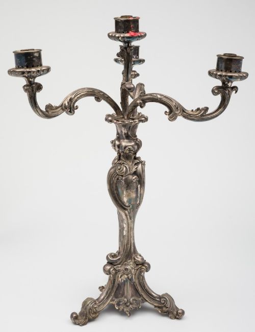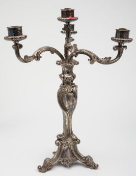 A Victorian plated three branch candelabra: crested, the circular nozzles with foliate sconces on swept and scroll branches issuing from a scroll decorated stem on acanthus capped scroll feet, 70cm. high.