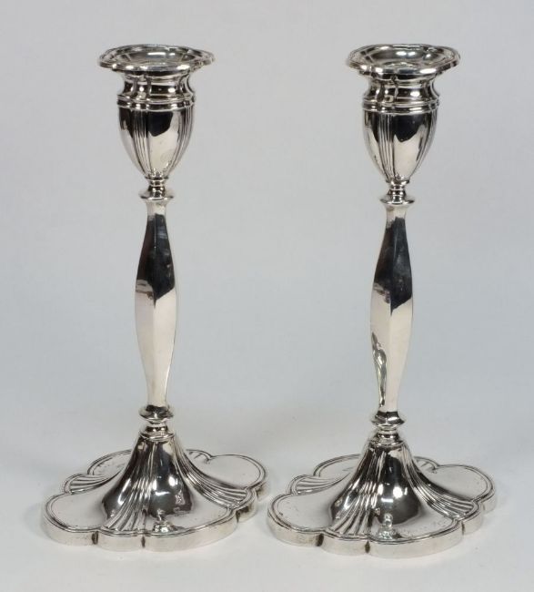 A pair of Elizabeth II silver candlesticks, maker Alexander Smith, Birmingham, 1959: inscribed, with oval urn shaped nozzles on a waisted and knopped stem, on a shaped oval base, 29.5cm. high, 24.34ozs.